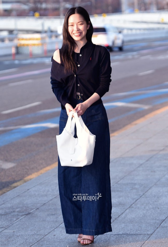 이날 류진은 검은색 카디건에 넉넉한 핏의 데님 와이드 팬츠를 매치해 편안하면서도 스타일리시한 느낌을 강조했다. 여기에 흰색 토트백을 들어 깔끔하고 밝은 분위기를 더했다.