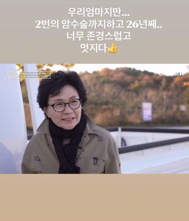 공개된 영상은 채널A '생존의 비밀'의 한 장면으로, '대장암과 갑상생암을 극복한 75세 점순 씨의 반전 직업'이라는 소개와 함께 배윤정의 어머니가 등장했다.