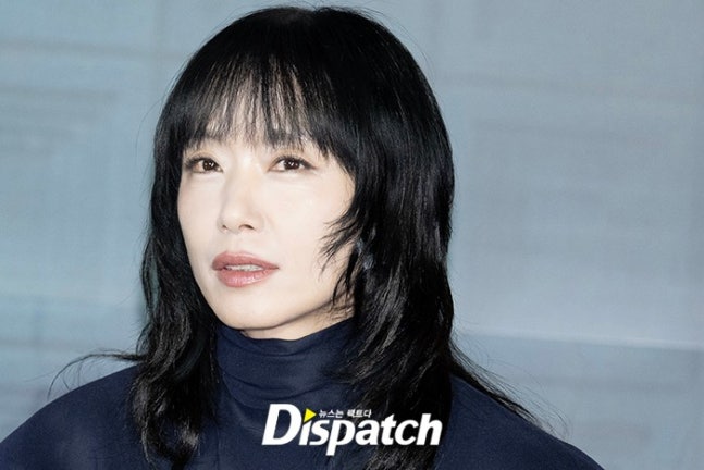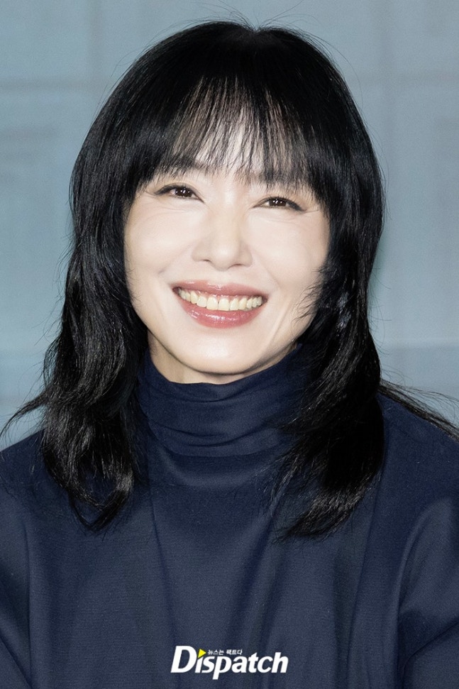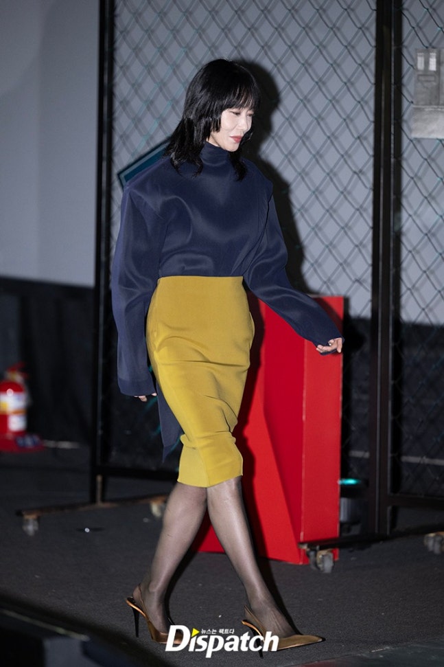 전도연은 네이비 블라우스와 머스터드 컬러의 스커트로 섹시한 분위기를 연출했다.