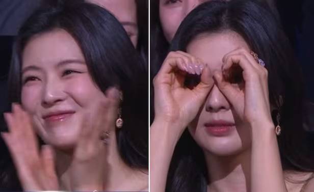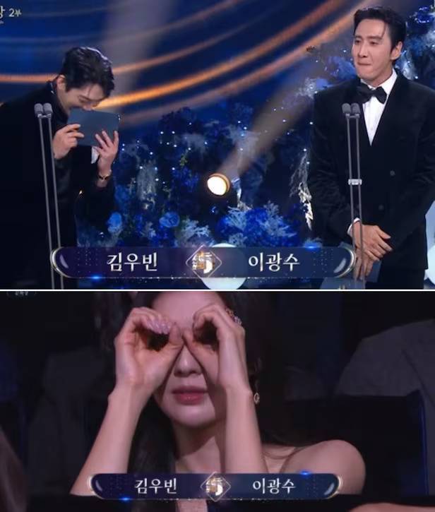 두 사람이 무대에 오르자 카메라는 이광수의 오랜 연인이자 객석에 앉아 있던 이선빈을 클로즈업했습니다. 김우빈과 이광수에게 박수를 보내던 이선빈은 카메라가 자신을 비추고 있다는 걸 알아채자마자 양손으로 망원경을 만들어 이광수를 보는 듯한 모습을 연출해 웃음을 자아냈습니다.
