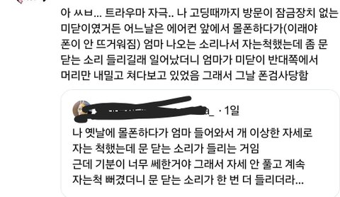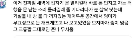 ㅅㅂ 너무 무섭잔아 울엄마는 나 차피 안자는거 아셔서 자라 한마디하고 문닫고 가시는데