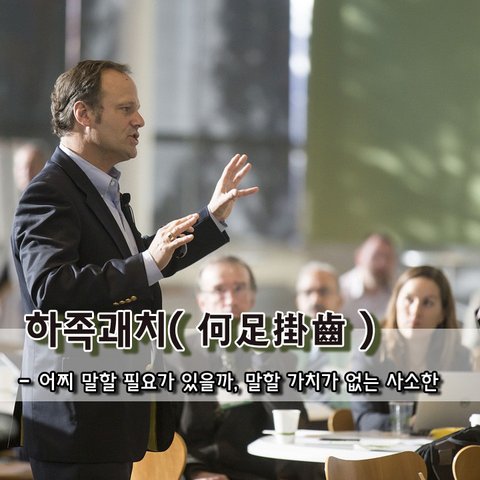 말을 할 자리가 아닌데 끼어들었다가 본전도 못 찾는 경우가 있다. 역시 이럴 때는 침묵이 제일인데 꼭 말해야 한다면 어찌 족히(何足) 말을 할 필요(掛齒)가 있겠는가 하며 물러서는 것도 방법이다. 말을 꺼낼 가치가 없는 사소한 일이라는 뜻도 된다.