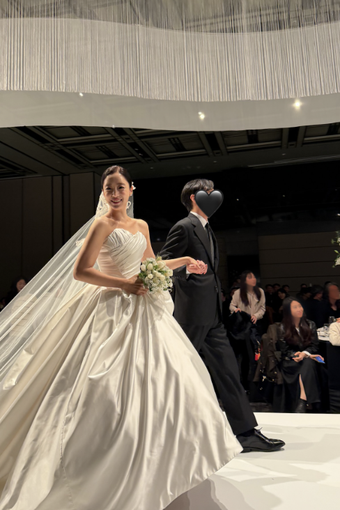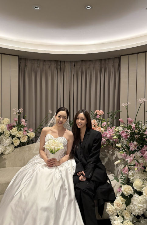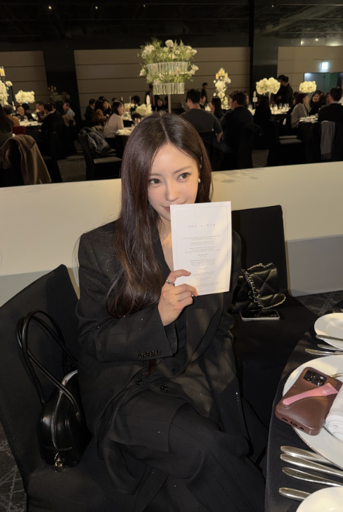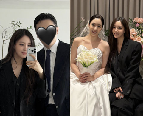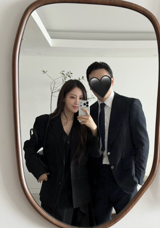 내추럴하게 흐르는 롱 웨이브 헤어와 차분한 메이크업은 전체적인 톤과 조화를 이루며 시크한 룩의 분위기를 한층 살렸다. 또 다른 사진에서 효민 옆에는 유사한 디자인의 수트를 입은 남편이 함께 서 있어, 부부의 미니멀 커플룩이 결혼식장의 단정한 드레스 코드와 어우러졌다.