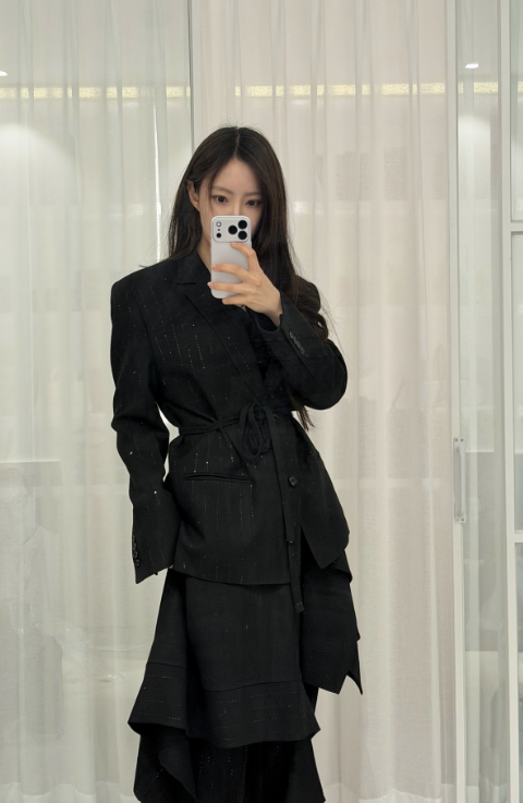 사진 속 효민은 올 블랙 수트룩으로 세련되고 시크한 분위기를 뽐냈다. 은은한 핀스트라이프 결이 더해진 재킷과 언밸런스 컷의 플레어 롱 스커트로 격식을 갖추면서도 유니크한 포인트를 더했다.