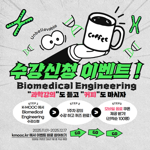 선착순 수강신청 이벤트 중이라 수강신청 후 1주차 과정만 마치면 커피쿠폰도 지급된다고 합니다~~수강신청은 아래 링크에서 가능해요!https://www.kmooc.kr/view/course/detail/17903?tm=20251205010550
