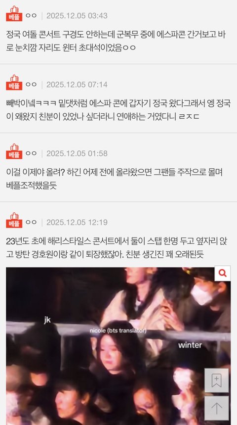 정국 여돌 콘서트 구경도 안하는데 군복무 중에 에스파콘 간거보고 바로 눈치깜 자리도 윈터 초대석이었음ㅇㅇ