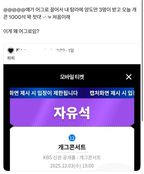 저거 올린 계정이 원빈 홈마 사담계인데 걍 자기가 평소에 개콘 좋아해서 보러간다고 올린건데 다른 팬들이 개콘에 라이즈 나오는줄 알고 다 북다닥 양도 받아서 관객 꽉 찼대 ㅅㅂㅋㅋㅋㅋㅋ