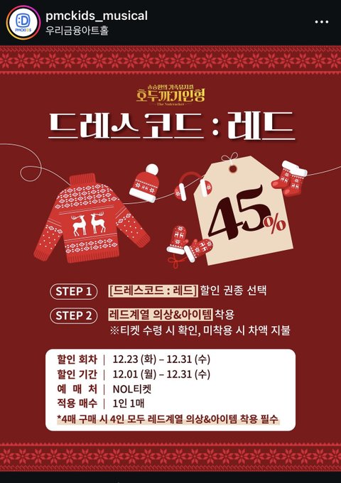 크리스마스 주에 예매하고 레드 아이템 착용하고 가면 45프로 할인이래요 사진찍기도 좋을 것 같고 예매 일정따라서 할인율도 조금씩 다르더라구요 11일부터 21일 공연에는 배우들하고 포토타임 있고