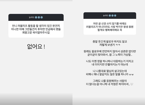 또 다른 팬은 "러블리즈가 아니더라도 평생 응원하겠다"고 전하기도. 이에 그는 "팔로우 하지도 않고 저렇게 보낸 거다. 굳이 찾아와서 그 노력이 가상하다"며 "나도 대응하는 거 지치고 내 이미지만 안 좋아지는 거 아는데 나름대로 열심히 살고 있는데 피해니 뭐니 말 같지도 않은 말을 하니까"라고 토로했다.