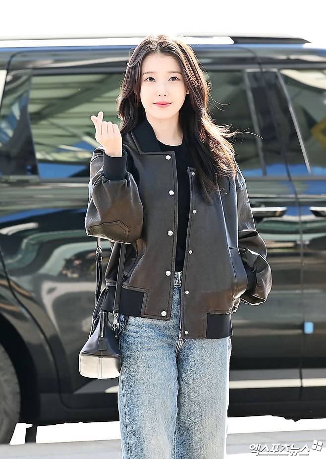 아우터와 이너를 모두 블랙으로 통일한 아이유는 연청 컬러의 와이드 데님 팬츠를 매치해 무거워보일 수 있는 룩에 캐주얼하고 산뜻한 포인트를 더했다.