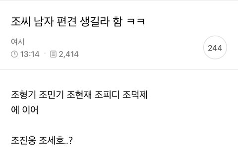 와 믿거조ㅇㅈㄹ 하는 애들보면 진짜 지능 떨어져보임..ㅋㅋㅋㅋㅋㅋ 갈라치고 갈라치다 못해 이젠 성으로 가르냐ㅋㅋㅋㅋ 진심 개멍청.. 다른 성씨가 훨씬 많아도 지들이 믿거조 의식해서 조씨 나올때마다 기억하는건데 그게 전부인줄 앎
