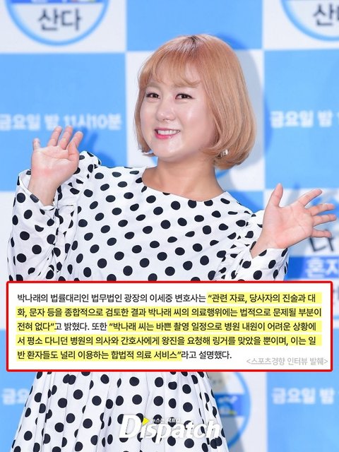 "① 관련 자료, 당사자의 진술과 대화, 문자 등을 종합적으로 검토한 결과 ② 박나래 씨의 의료행위에는 법적으로 문제될 부분이 전혀 없습니다. ③ 박나래 씨는 바쁜 촬영 일정으로 병원 내원이 어려운 상황에서 ④ 평소 다니던 병원의 의사와 간호사에게 왕진을 요청해 링거를 맞았을 뿐이며, ⑤ 이는 일반 환자들도 널리 이용하는 합법적 의료 서비스입니다.” (광장)