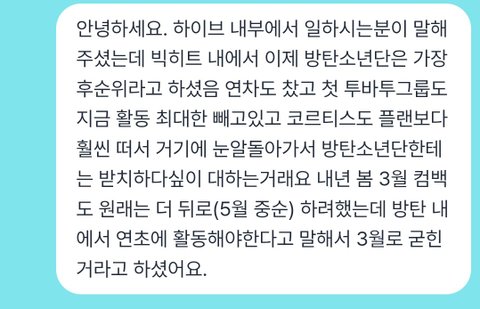 다 입닫고 회사 욕이나해 회사가 막은거임 이미 좀 예상은 했는데 ㅆㅂ 족같다 지들 신인 키울라고 미룬거래 원래는 5월이였대 근데 애들이 늦는다고 3월 앞당긴거래 제발 그만하자