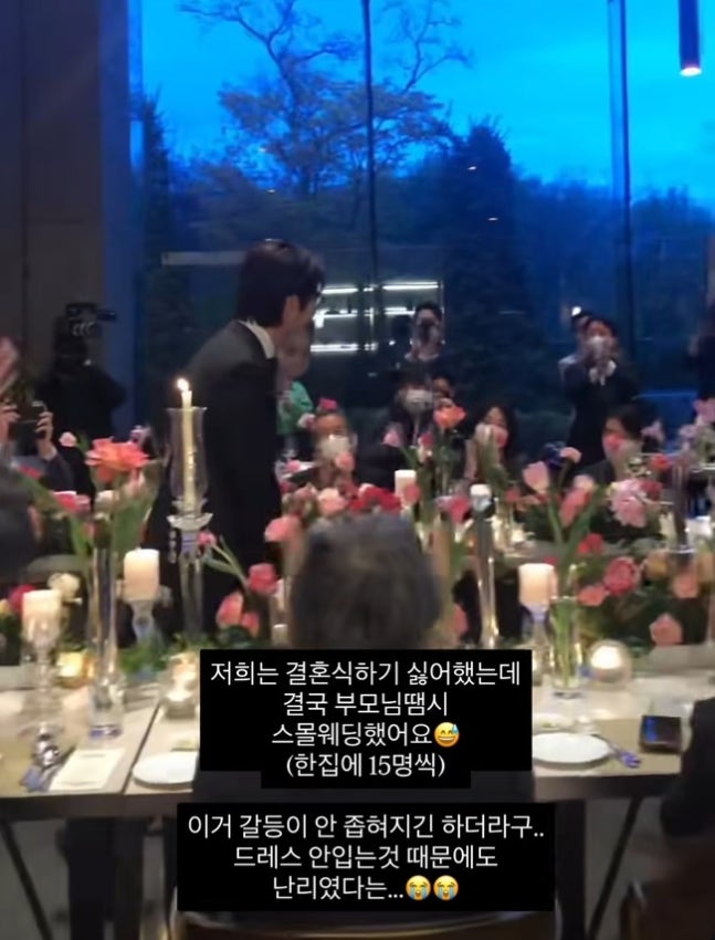 미자 소셜미디어한 팔로워는 미자에게 "전 결혼식 하고 싶은데 남자친구가 끝내 결혼식 올리기 싫다 해서 헤어졌어요"라고 질문을 남겼다. 미자는 "저희는 결혼식 하기 싫어했는데 결국 부모님 때문에 스몰 웨딩 했어요(한 집에 15명씩)"이라고 답했다.