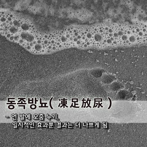 이것을 잘 나타낸 속담이 ‘언 발에 오줌 누기’다. 추위로 꽁꽁 언 발(凍足)에 오줌으로 녹여(放尿) 잠시 따스한 효과는 보았더라도 그 물기까지 더 얼어붙는다. 우리 속담을 한역한 ‘旬五志(순오지)’에 나오는데 趙在三(조재삼)의 ‘松南雜識(송남잡지)’에는 凍足放溺(동족방뇨, 溺은 빠질 닉, 오줌 뇨)로 되어 있다.