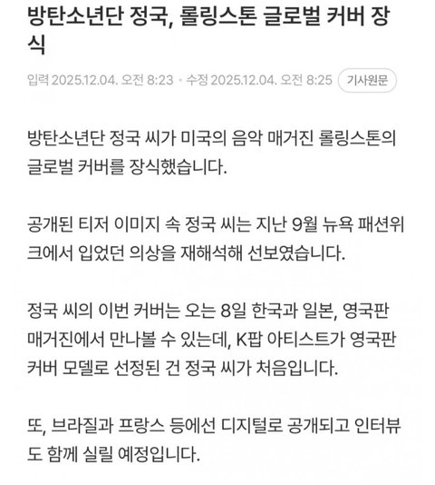 롤링스톤 UK판 최초 K팝 솔로 커버 장식 대단해 정국이