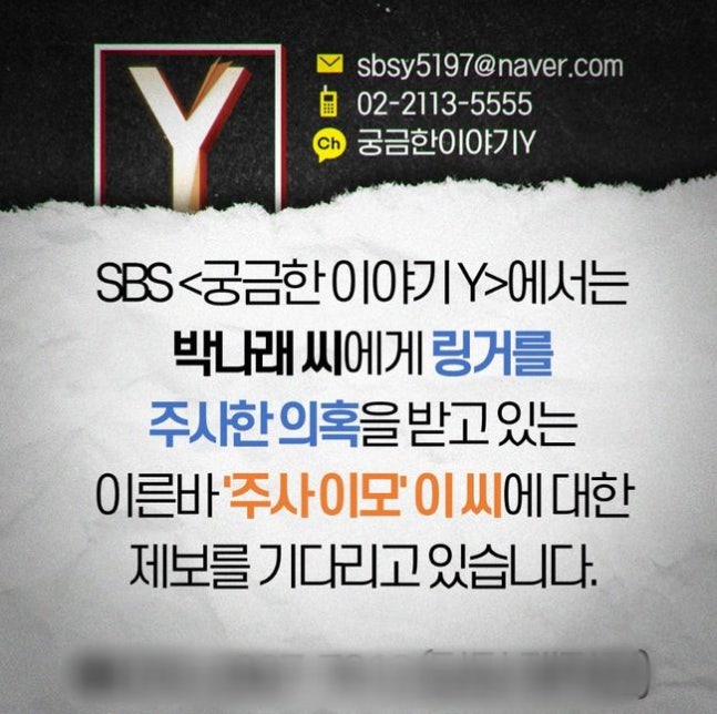 박나래의 ‘주사 이모’ 논란은 여기서 마무리되지 않을 전망이다. 8일 SBS ‘궁금한 이야기 Y’ 측은 공식 계정을 통해 “박나래 씨에게 링거를 주사한 의혹을 받고 있는 이른바 ‘주사 이모’ 이 씨에 대한 제보를 기다리고 있습니다”라며 취재를 진행 중이라고 밝혔다.