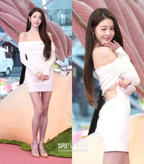이날 장원영은 순백의 오프숄더 미니드레스로 청순미와 섹시미를 동시에 뽐냈다.