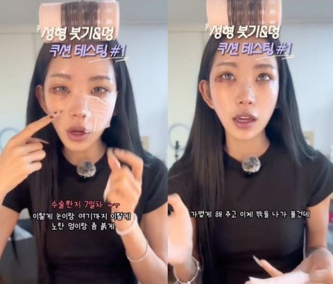 이 가운데 그는 "수술한 지 7일 차"라며 눈가가 성형 수술 후유증으로 붉게 멍든 모습을 가감없이 드러내 시선을 모았다. 이에 그는 "눈 밑에 노랗고 붉게 멍이 들었다"라며 "어저께 실밥을 풀었다"라며 눈 성형 수술을 고백했다.