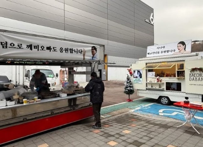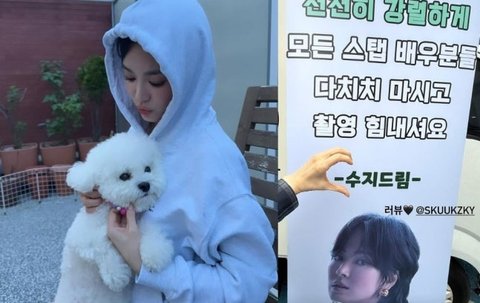 공개된 사진엔 수지가 송혜교를 위해 준비한 커피차 풍경이 담겼다. 수지는 커피차 곳곳에 "지니야, 혜교 언니를 응원한다" "'천천히 강렬하게' 모든 스태프 배우 분들 다치지 말고 촬영 힘내시길" "현장을 지켜주시는 스태프 배우 분들 맛있는 커피 드시길" 등의 메시지를 남기며 송혜교와 '천천히 강렬하게'를 응원했다.