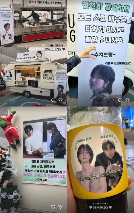 수지가 보낸 커피차에는 송혜교의 사진과 함께 “지니야 혜교 언니를 응원합니다”, “‘천천히 강렬하게’ 모든 스태프 배우 분들 다치지 마시고 촬영 힘내셔요”라는 멘트가 적혀 있었다. 수지는 ‘다 이루어질지니’에 지니야 역으로 특별 출연한 송혜교를 언급하며 응원 메시지를 전해 눈길을 끌었다.