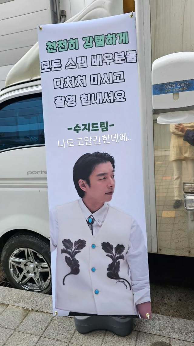공유 소셜미디어공개된 사진 속에는 넷플릭스 시리즈 '천천히 강렬하게'(가제) 촬영 현장에 수지가 커피차와 함께 보낸 응원 문구가 적힌 배너가 담겼다. 수지는 "천천히 강렬하게 모든 스태프 배우분들 다치지 마시고 촬영 힘내셔요", "덤으로 깨비오빠도 응원합니다"라는 응원의 메시지를 전달했다.