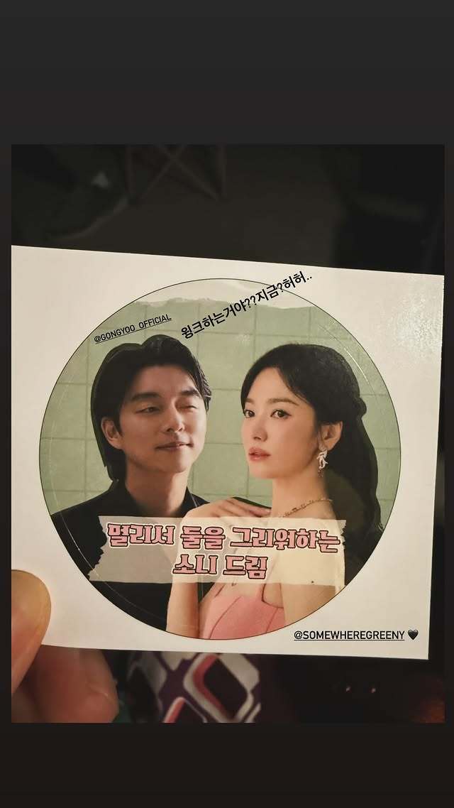 스티커 속 공유는 윙크를 하고 있다. 이에 송혜교는 공유의 소셜미디어 계정을 태그 하며 "윙크하는 거야?? 지금? 허허.."라고 의견을 남겼다.