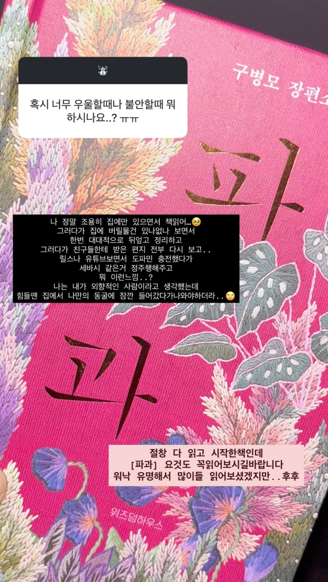이어 “요즘 또 한번 성장의 단계를 거쳐가고 있는 건지, 심리적으로 조금 힘든 시간을 보내고 있었다”며 “응원 메시지 보내주시는 거 읽을 때마다 덕분에 조금씩 더 힘낼 수 있는 것 같다. 자기 전에 문득 DM 들어갔다가 눈물 광광한 적 123456789번”이라고 덧붙였다.