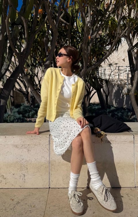 손연재는 노란색 가디건을 소화했다.