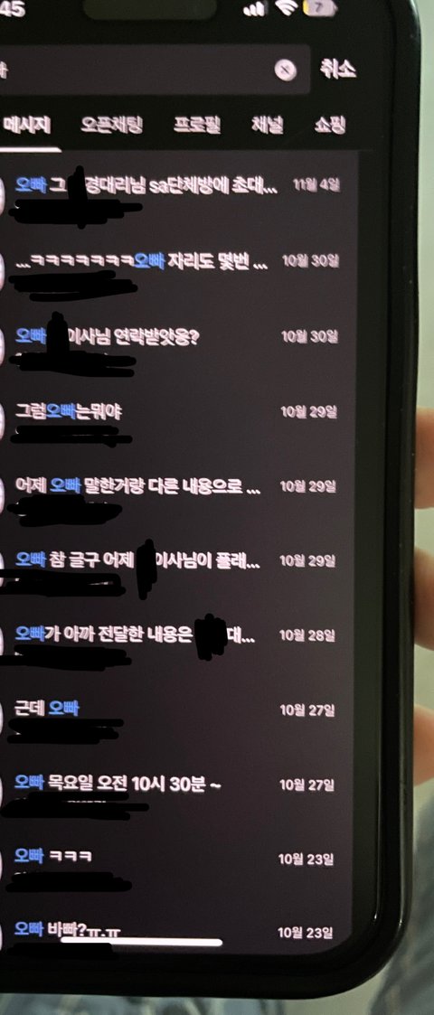 *나는 남자 팀장의 아내이고 다른일로 싸우다가 회사에서 친한 사람들끼린 다 형/동생 하듯이 오빠/동생도 같은거다 라고 하길래 카톡에 “오빠” 검색해보니 나온 대화목록이야. 오빠라고 부르는 사람은 여자 팀원 한명 뿐이길래ㅎㅎ