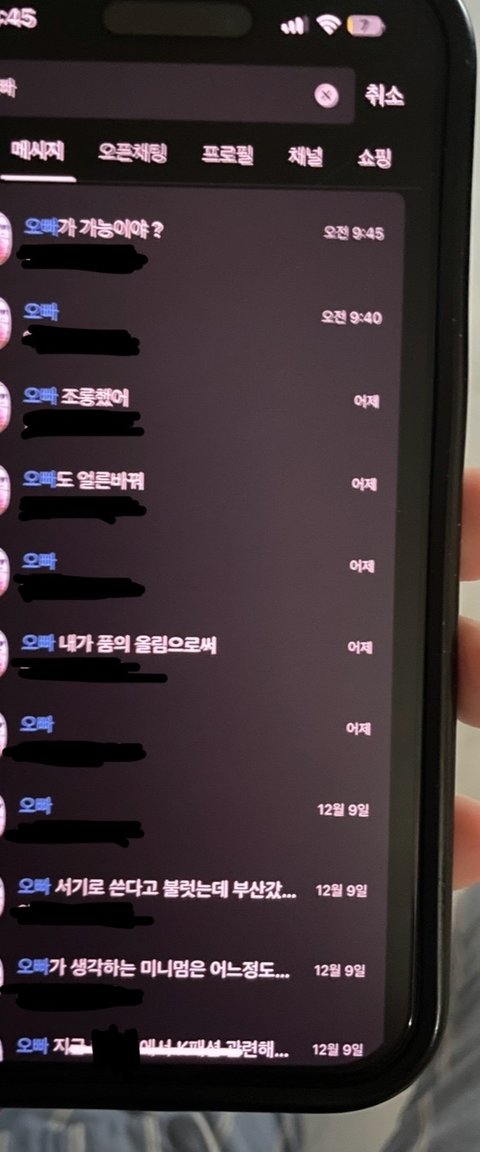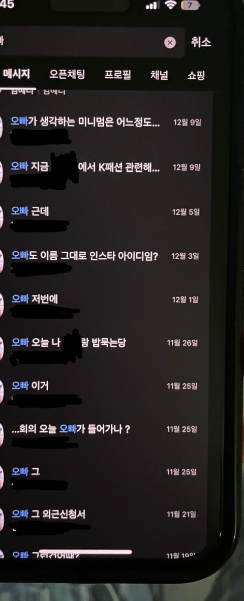 12/11일 남편 연락 문제로 다투다가 카톡에 5일에 얘기한 “오빠”라고 부르는 팀원이 아직도 ”오빠“라고 업무얘기를 하는것을 발견. 아직도 이러네? 이거 좀 문제있지않아? 라고 말하니 회사에서 다들 이런다고함. 친한사람들끼린 형/동생 하듯이 오빠/동생도 한다고 다들 이러고 산다고함. 그래? 그럼 카톡에 ”오빠“ 검색해봐 다 그러면 카톡에 남아있겠지. 검색했더니 나온게 본문 사진임 남편회사에서 남편에게 ”오빠“라고 부르는 여자직원은 단 한명뿐이었음