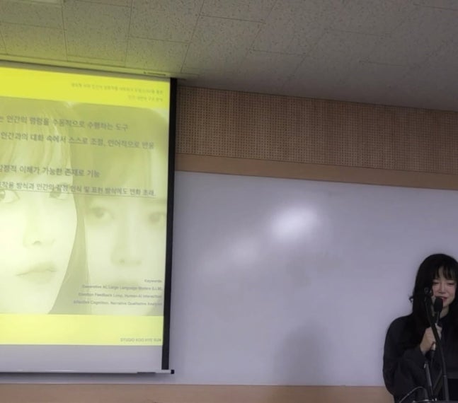 공개된 사진 속 구혜선은 어두운 셔츠 차림으로 단정한 모습으로 서 있으며, 차분한 미소 속에서 진지한 열정이 느껴진다. 강연 중인 구혜선의 뒤로는 직접 그린 그림이 슬라이드에 담겨 있어 예술과 연구를 동시에 아우르는 구혜선의 다재다능한 면모가 돋보인다. 무대 위에서 마이크를 잡고 발표하는 모습은 배우의 이미지 너머 학자로서의 깊이를 보여준다.