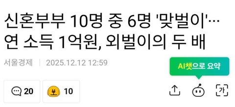 맞벌이 부부가 연봉1억이 60% 라네요?