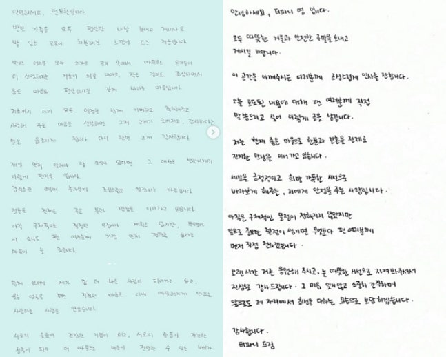 변요한이 쓴 손 편지(왼쪽), 티파니 영이 쓴 손 편지. 사진 출처=변요한, 티파니 영 개인 계정한편 변요한과 티파니 영은 지난해 5월 공개된 디즈니+ 오리지널 시리즈 '삼식이 삼촌'에서 호흡을 맞췄다.변요한은 2011년 영화 '토요근무'로 데뷔, 드라마 '미생', '육룡이 나르샤', '미스터 선샤인', '백설공주에게 죽음을-블랙아웃' 등과 영화 '한산: 용의 출현', '보이스', '중간계' 등에 출연해 열연을 펼쳤다.