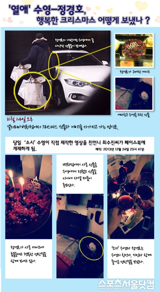 두 사람의 달콤한 크리스마스 파티는 수영의 친언니 최수진의 SNS에서도 포착됐다. 수영이 등장하는 크리스마스 파티 영상에는 정경호가 구입한 샤넬 쇼핑 백과 케이크가 등장해 두 사람이 이브를 함께 보낸 것을 증명한다. 수영은 영상에서 애교 넘치는 표정을 보여 주며 행복한 기분을 나타내 눈길을 끌었다.