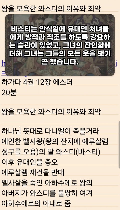 와스디가 독자들은 불쌍해 보이지만 여왕은 다니엘을 미워했고 그래서 유대인 여인들을 거룩한 안식일에 일부러 일하게 했고 알몸으로 일하게 해 모욕을 줌