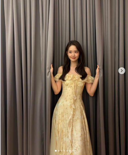 공개된 사진 속 윤아는 커튼 사이에 선 채 연한 골드 톤의 오프숄더 드레스를 입고 청초한 분위기를 발산하고 있다. 어깨 라인이 자연스럽게 드러나는 디자인과 잘록한 허리선이 어우러지며 특유의 우아한 실루엣을 완성했다.