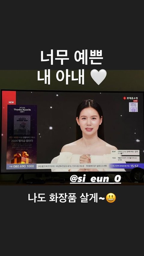사진 속 박시은은 어깨 라인이 시원하게 드러나는 의상을 입고 화장품을 판매하며 우아하고 세련된 매력을 뽐내고 있다. 화면 속에서도 빛나는 박시은의 미모에 진태현은 감탄을 금치 못하고 즉석에서 '강제 구매 선언'까지 한 것이다.