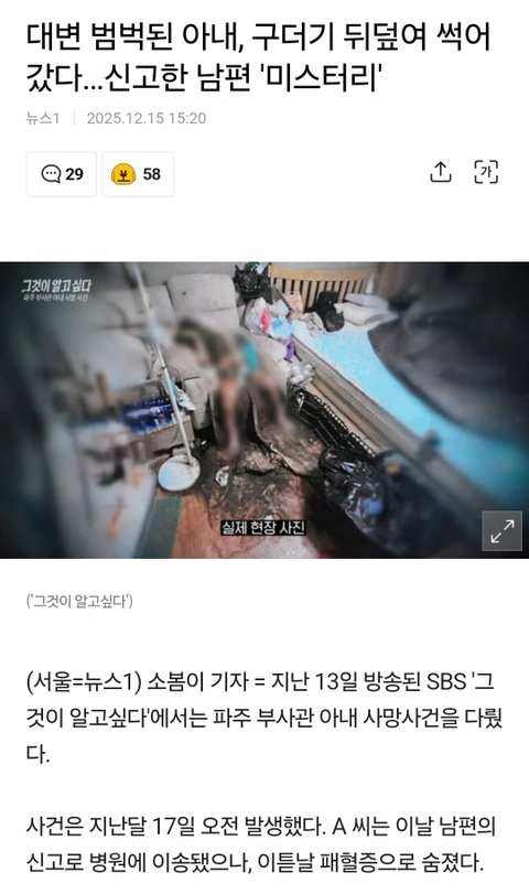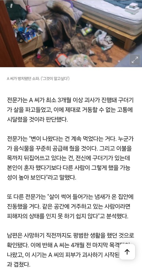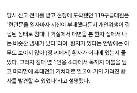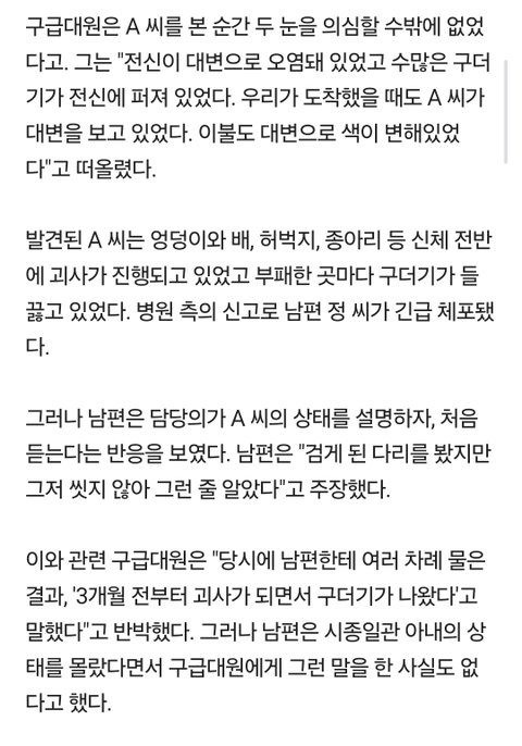 이 남편 유기치사로 10년 밑으로 징역 살수 있다함 혼자 처먹으러 다니고 술먹으러 남의집 가서 앉아있고 꼴배기시름 부인이 그지경인데 어두워서 못봤대 구급대가온순간에도 대변이나오고있었음 인간임?