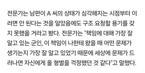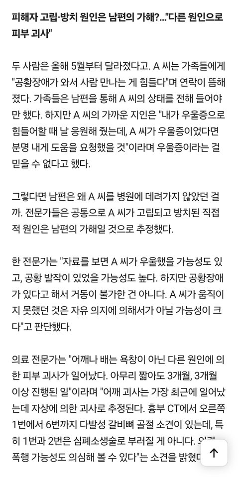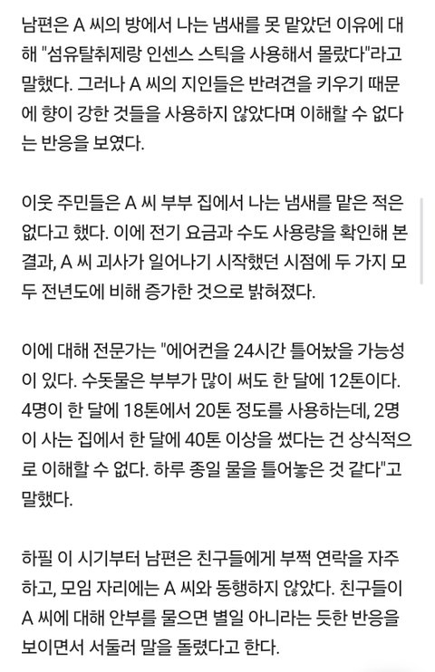 전문가들은 남편의 가스라이팅을 의심하고 있으나 아직 밝혀진 건 없음.