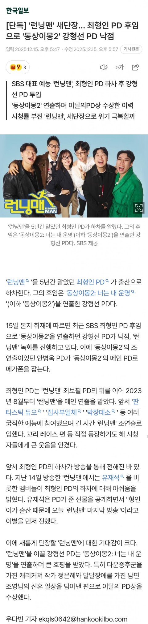 [단독] '런닝맨' 새단장…최형인 PD 후임으로 강형선 PD 낙점
