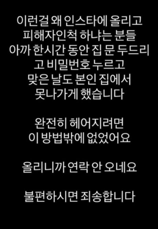 재키와이는 “감금 이후에는 ‘어떻게 헤어지지’라는 생각밖에 들지 않았다”며 “음악을 못 해도, 이미지가 나빠져도 상관없었다. 그냥 살고 싶었고 헤어지고 싶었다”고 토로했다. 해당 게시물들은 현재 모두 삭제된 상태다.