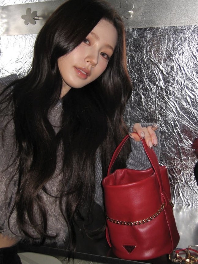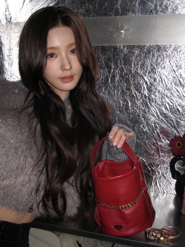 크리스마스트리를 배경으로 한 사진에서는 홀리데이 무드가 극대화된다. 미연은 레드 버킷백을 두 손으로 꼭 끌어안은 채 은은한 미소를 띠고 있어, 선물 상자를 품은 겨울 요정을 연상케 한다.