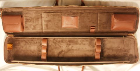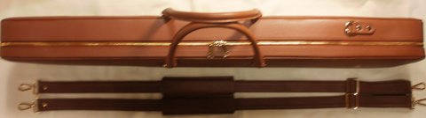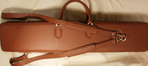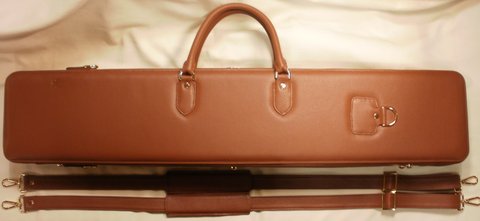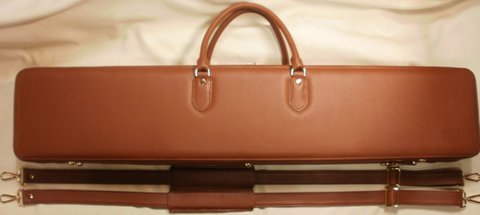 브라운 컬러의 부드러운 오플 엠보싱 가죽으로 제작한 대금 및 산조 3개 수납용 천연 가죽 대금가방입니다.(가로 94cm,세로 18cm,두께 8cm)
