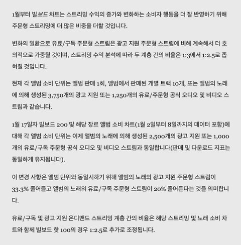 빌보드200 핫백 둘 다 스트리밍이 더 중요해지고 그 중에서도 무료 계정 스트리밍보다 유료 계정 스트리밍 비중이 올라간다는 말인 듯 걍 스포티파이 프리미엄 쓰라는 말 ㅇㅇ 여기도 참 꾸준히 뭘 많이 바꾸네