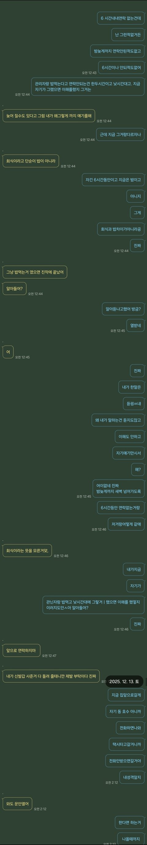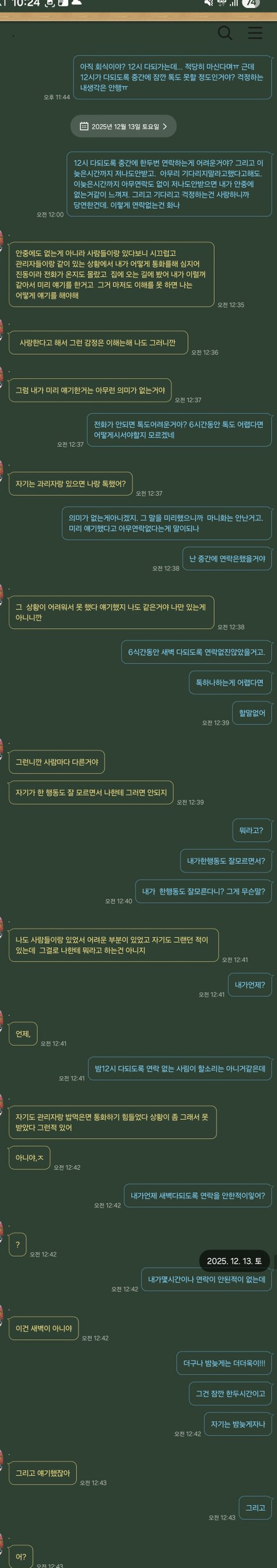 남친이 회사회식으로 저녁 6시반부터 12시쯤까지 연락이 안되었어요. 점심때 미리 저한테 회식인데 전화 못받을수도 있다. 관리자들과 있어서 쉽지않을수있으니 걱정말고 기다리지말고 먼저자라고해줬고 알겠다했어요. 평상시 술을 즐기지도 잘 먹지도 않고 술자리없는 집돌이고 그런부분에선 믿을만한 사람이라 그러려니했어요. 일끝나고 회식 이동하기직전 저녁6시반까지는 연락해줬고 본격적 회식 시작후는 밤12시까 연락없어서 저렇게톡을했다가 다퉜습니다. 제생각 입장 생각도 안하고 자기가뭘잘못했냐 이래서 그러다 제가 예전에 낮에 미리 귀뜸없이 회사상사랑 점심먹느라 연락못한 점심시간 한시간 가지고 넌안그랬냐 이난리ㅡ.ㅡ