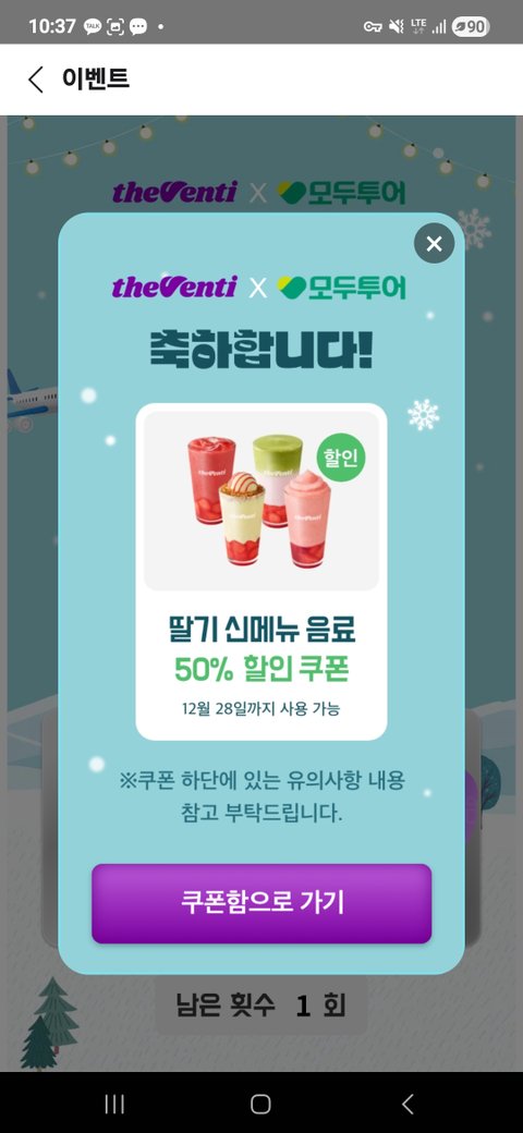 앱 들가면 딸기 신메뉴 음료 무료 쿠폰도 있고, 할인 쿠폰도
