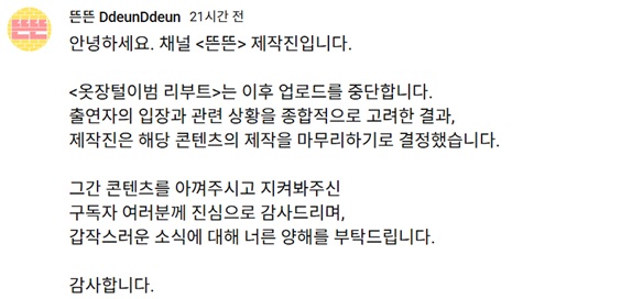 콘텐츠를 시청했던 구독자들은 "진짜 재밌었는데 아쉽다", "유재석도 마음고생 심하실 듯", "중단 결정이 맞는 것 같아요" 등의 반응을 보이고 있다.