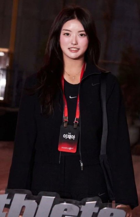 사진 속 이재아는 나이키 로고가 새겨진 의상을 입고 행사에 참석한 모습으로, 목에는 출입 배지를 걸고 당당한 포즈를 취하고 있다.