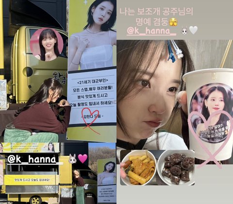 19일 아이유는 자신의 개인 인스타그램 내 스토리 기능을 통해 뱅 강한나에 받은 응원 간식차 사진을 여러 장 게재했다.